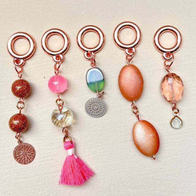 Steekmarkeerders – JJ Beads Rose Gold | Deze prachtige steekmarkeerders zijn perfect voor jouw breiwerk. Hang de markeerder eenvoudig aan je breinaald en je weet precies wanneer je nieuwe rij begint! De set bestaat uit 5 steekmarkeerders in prachtige kleuren. Zoals rose gold, groen, pastel roze en brons.