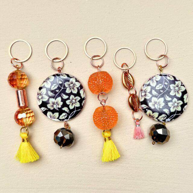 De kralen in deze set hebben een betoverend bloemenpatroon dat doet denken aan vintage porselein en klassieke borduurmotieven. Twee opvallende oranje kralen zijn afgewerkt met een charmant geel kwastje, wat een speels en elegant accent geeft aan je breinaalden. Elke steekmarkeerder is met de hand geassembleerd, wat elk exemplaar uniek maakt.